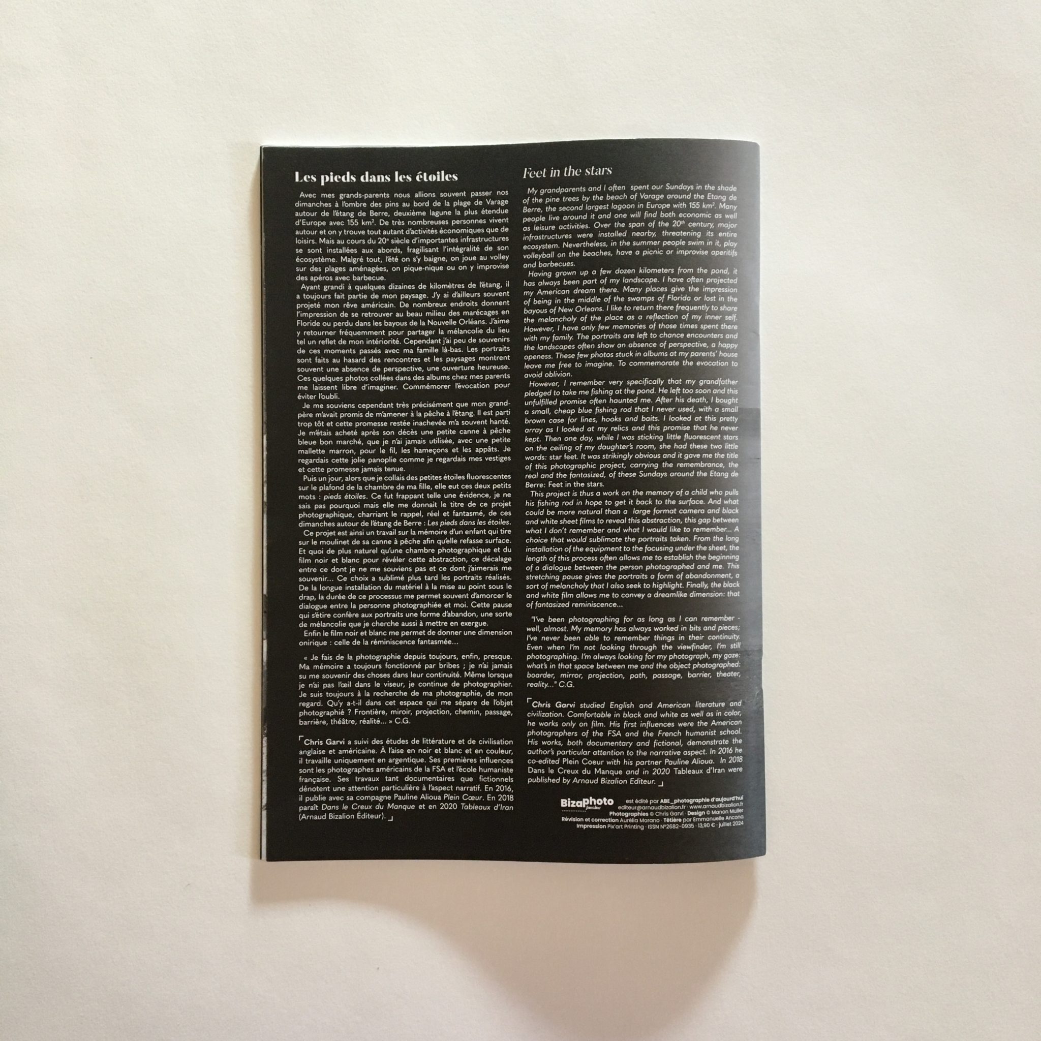 C’est un souvenir d’enfance tenace, celui des rendez-vous en famille le dimanche à l’ombre des berges de l’Étang de Berre (le plus grand étang d’eau salée d’Europe), paysage diversifié prenant tour à tour l’apparence des marécages de Floride ou des bayous de la Nouvelle Orléans.. L’été, les rires, les baignades, les pique-niques, les apéros et les barbecues avec les habitants des rives de la lagune ont accompagnés Chris Garvi tout au long de sa vie. Mais c’est aussi un lien intime avec les disparus et leurs promesses inachevées comme celle de son grand-père d’aller pêcher ensemble dans l’Étang. Ces actes manqués n’ont cessés d’hanter le petit garçon devenu grand qui accumulait les vestiges de ce temps révolu, à l’image du nécessaire de pêche acheté en hommage mais jamais utilisé. Malgré tout avec les années la mémoire s’estompe et les instantanés de ces instants bénis d’innocence et de bonheur manquent cruellement. Telle une course contre le temps, le photographe cherche à commémorer l’évocation pour éviter l’oubli et ainsi dissiper un peu sa mélancolie. Une aide providentielle lui fut apportée par sa petite fille qui un soir en fixant les étoiles fluorescentes du plafond dit deux mots, « pieds étoiles », deux mots qui donnèrent un nom et un sens nouveau à ce projet photographique de la réminiscence.